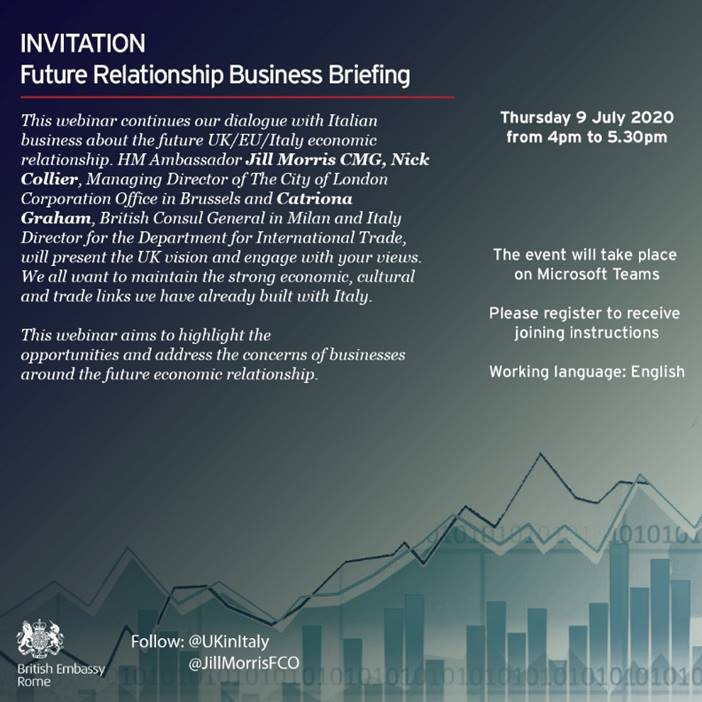Durante l'evento l'Ambasciatore fornirà un aggiornamento sullo stato attuale delle negoziazioni fra Europa e Regno Unito e sulle relazioni future.
