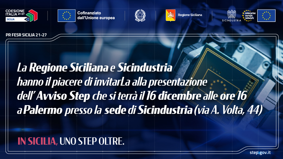 La S.V. è invitata alla presentazione dell’Avviso STEP, che si terrà martedì 16 dicembre 2025 alle ore 16:00, presso la sede di Sicindustria, in via A. Volta 44, Palermo.