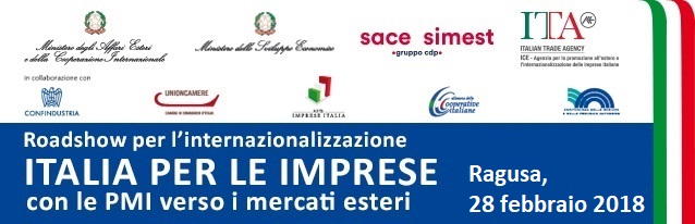 Mercoledì 28 febbraio 2018 dalle ore 08:30 alle ore 17:00, presso il Poggio del Sole Resort (C.da Magazzinazzi, Strada Provinciale 25 Km 5,7, Ragusa), le istituzioni e le organizzazioni imprenditoriali incontrano le aziende sui temi dell'internazionalizzazione nel corso di un Roadshow promosso e sostenuto dal Ministero dello Sviluppo Economico e organizzato da ICE-Agenzia in collaborazione con CNA Ragusa, partner territoriale dell'iniziativa.