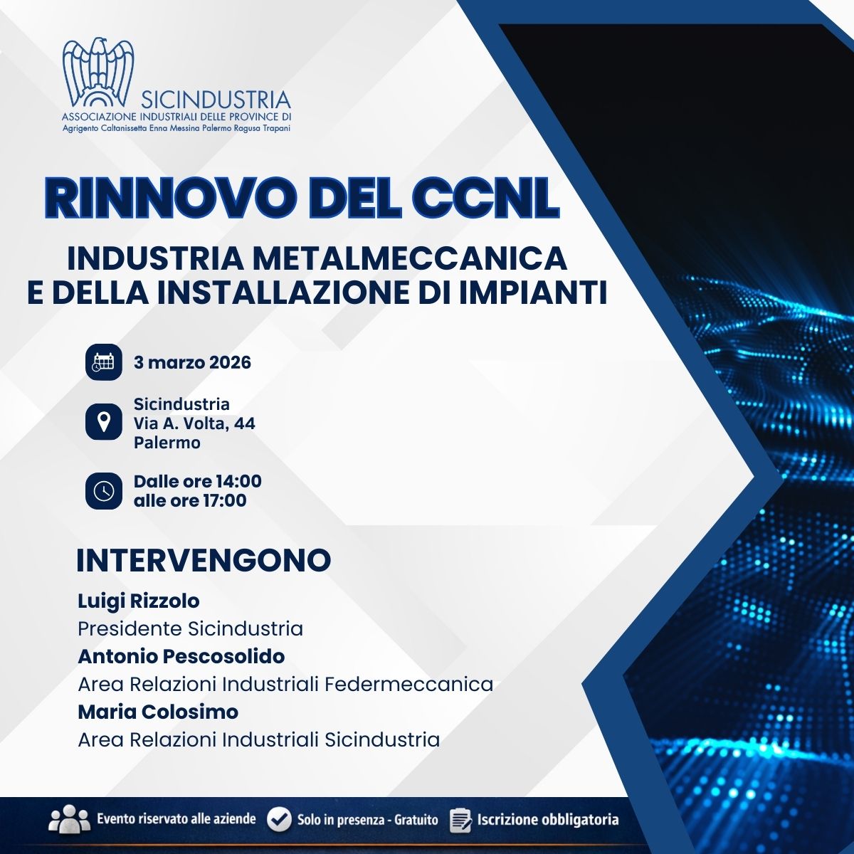 Sicindustria organizza un incontro di approfondimento dedicato al rinnovo del CCNL siglato da Federmeccanica ed Assistal con FIM, FIOM e UILM in data 22 novembre 2025.