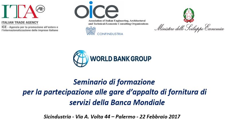 Mercoledì 22 febbraio, a Palermo, a partire dalle 9:30 presso i locali di Sicindustria (via A. Volta, 44), la World Bank, OICE Confindustria, ICE e Ministero dello Sviluppo Economico, in collaborazione con Sicindustria/Enterprise Europe Network, organizzano un incontro formativo, che ha l'obiettivo di consentire alle imprese di valutare le proprie reali potenzialità di concorrere con esito positivo alla gare della Banca Mondiale e di comprendere operativamente le procedure e le modalità di partecipazione alle stesse, conoscere il percorso da seguire per preparare un’offerta competitiva e vincente e svolgere azioni di simulazione operativa della partecipazione ad una call.