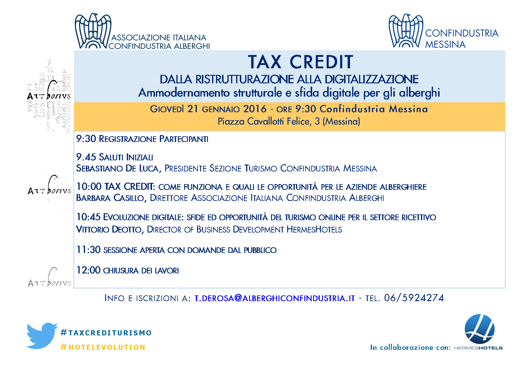 L’Associazione Italiana Confindustria Alberghi organizza l’incontro su “Tax Credit: dalla Ristrutturazione alla Digitalizzazione. Ammodernamento strutturale e sfida digitale per gli Alberghi ", che si svolgerà il prossimo 21 gennaio, alle ore 9.30, presso Confindustria Messina.