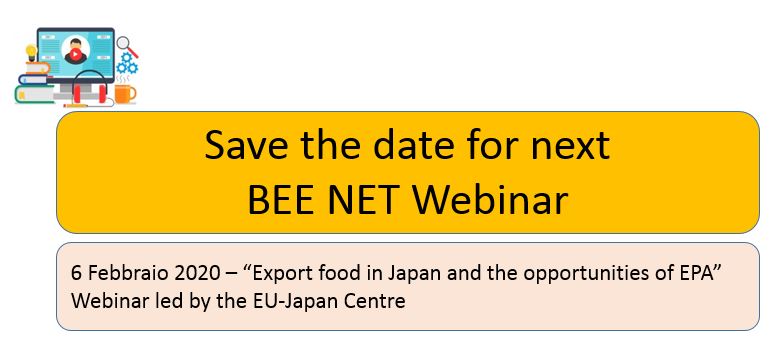 Giovedì 6 Febbraio dalle 10:30 alle 11,30, BEE NET (Building European Export Networks) promuove il Webinar "Export food in Japan and the opportunities of EPA", dedicato all'export di prodotti agroalimentari in Giappone e alle opportunità offerte dall'accordo di libero scambio.
